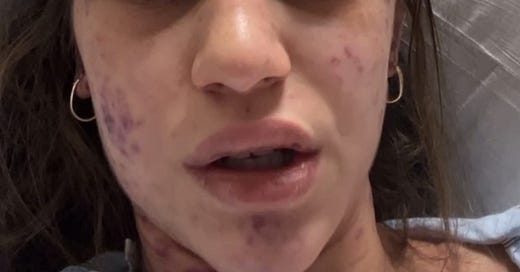 It's been getting worse and worse. At first, it was just little red dots right here that look like pimples. And then my face turned purple and it's just getting worse and spreading throughout the whole day.