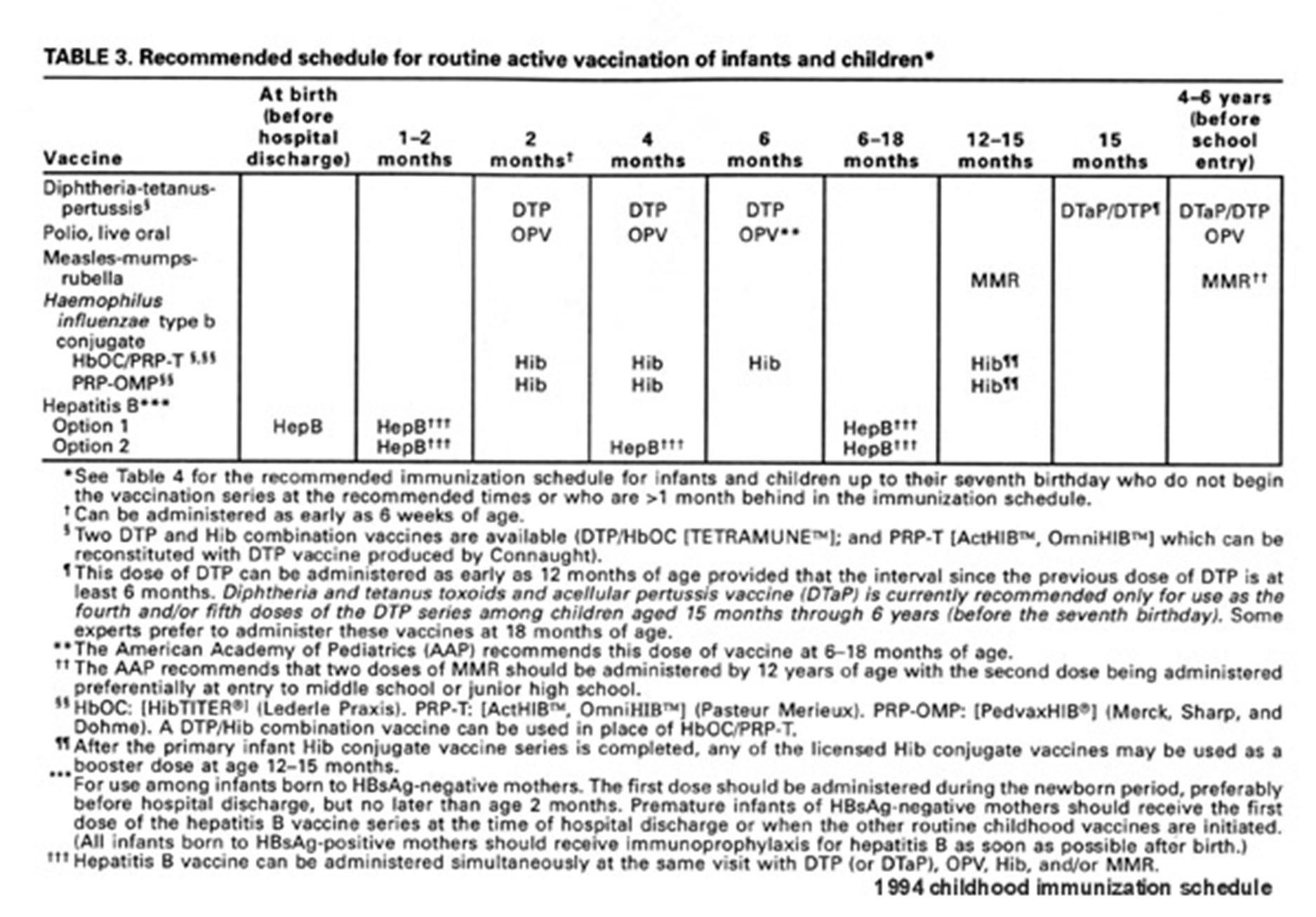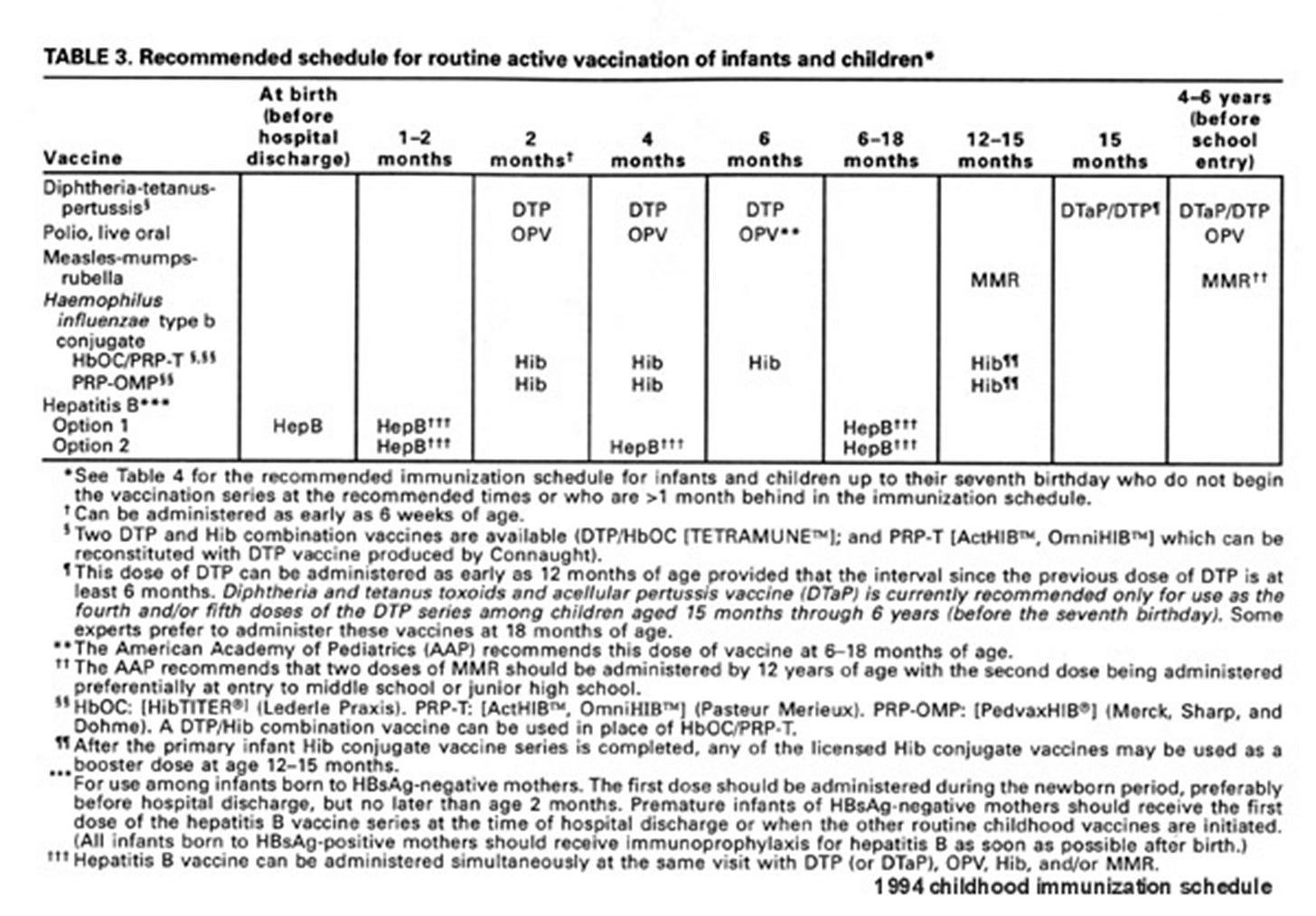 By 1994, the ACIP’s recommended childhood schedule included 21 injections against nine diseases by the age of fifteen months, more than doubling the recommendations made in 1983 (14). The major difference between the 1983 schedule and the 1994 schedule involved vaccinating infants against Hepatitis B, and against Haemopholis Influenza type B (HiB). The series for hepatitis B was begun within hours of birth for infants born to mothers who tested positive for the hepatitis B virus, and at two months of age for those whose mothers were not infected (15).